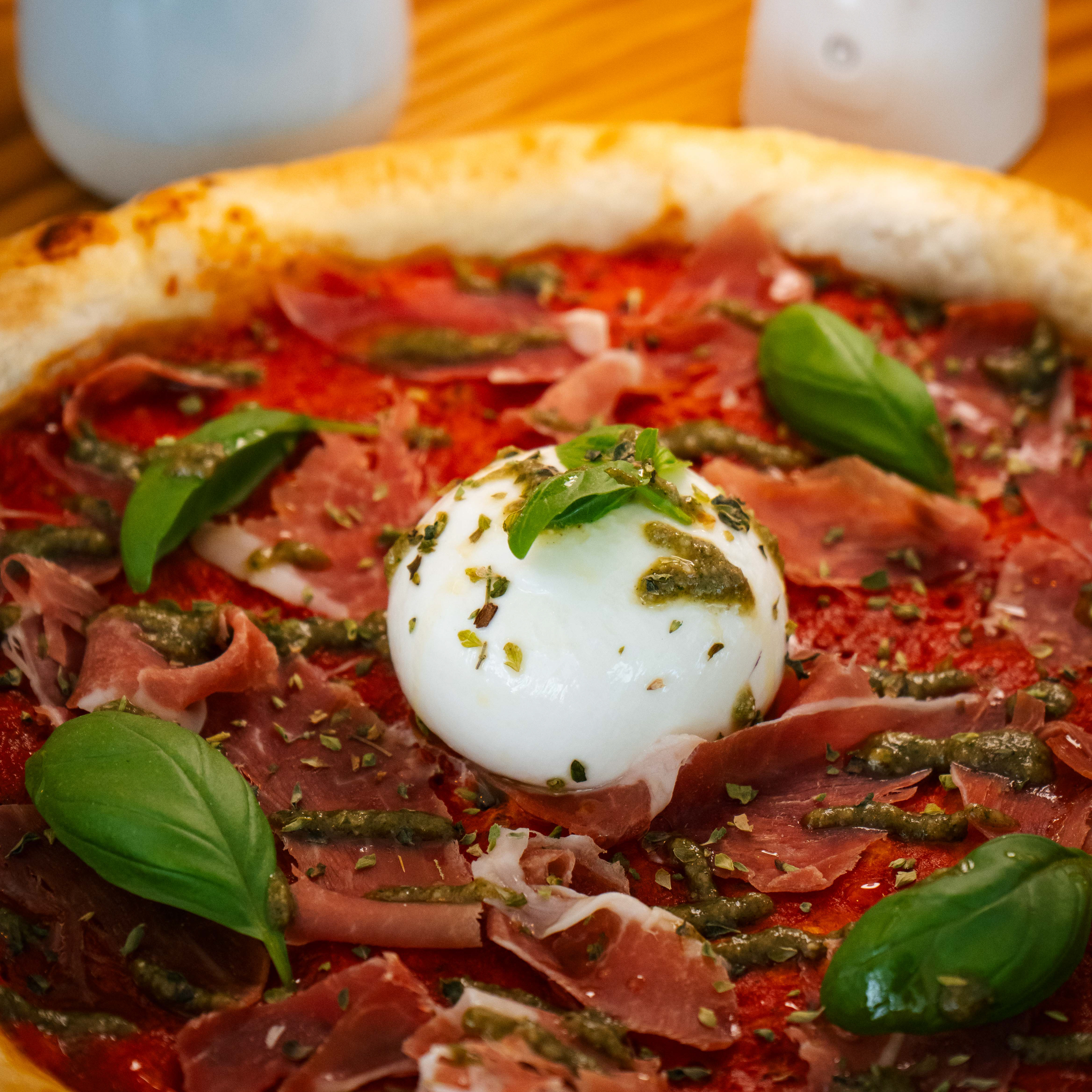 tomate, mozzarella fior di latte, presunto, queijo parmesão, rúcula e tomate fresco